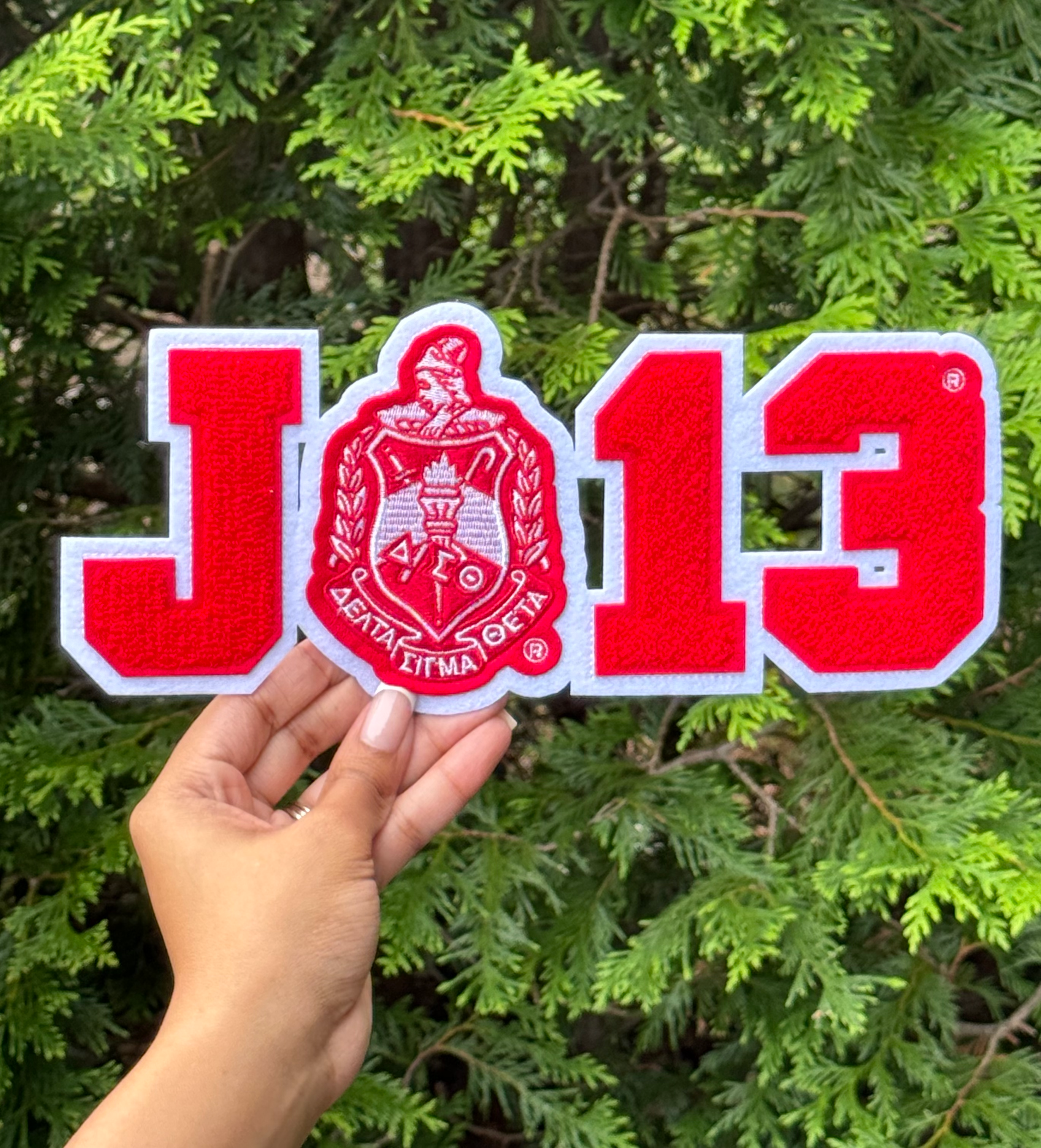 This cute Delta Sigma Theta Inspired Red & White J13 Iron-On Patch has been designed and created by us at Greek-ish & Co.