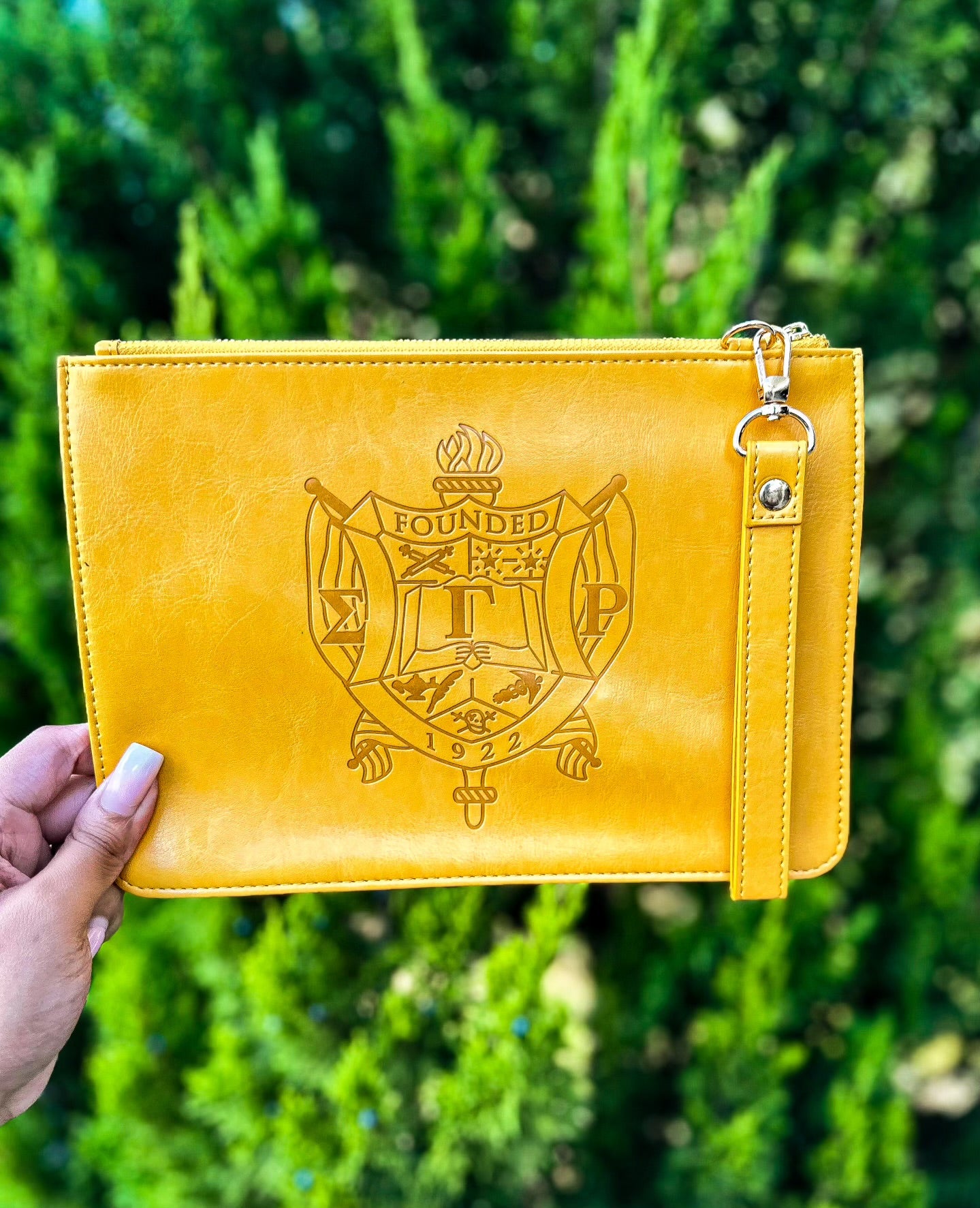 Introducing our SGRHO Clutch Wristlet Bag, featuring a striking golden yellow color with the sorority's shield.